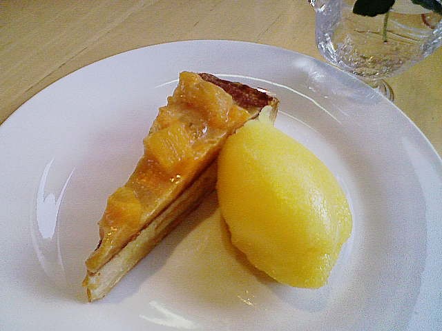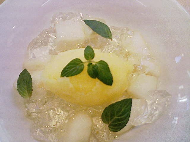 鶏肉の煮込み・オリーブとトマトのソース、洋ナシと白ワインのジュレ・オレンジのソルベ添え