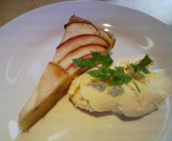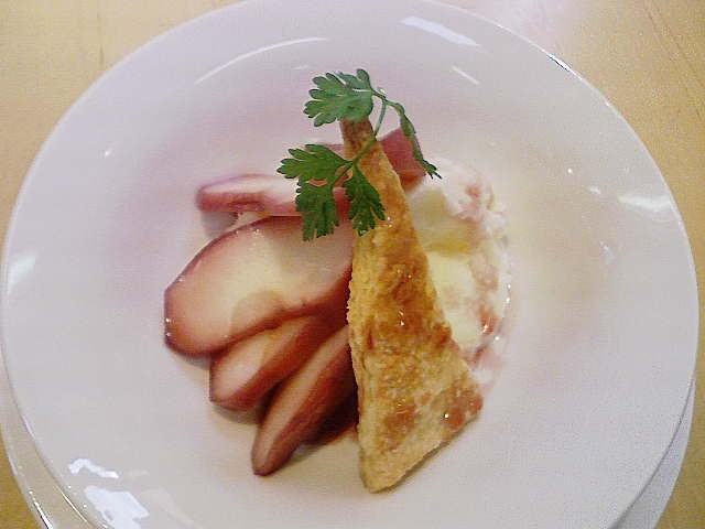 デザートはコンポートにソルベ、あと、さくさくパイが上にちょこんとつきます。